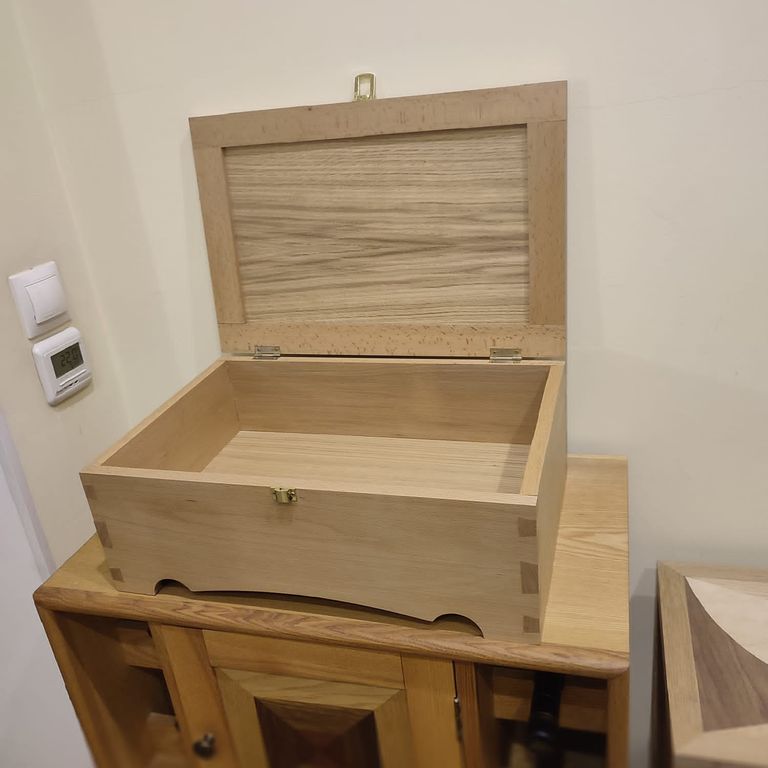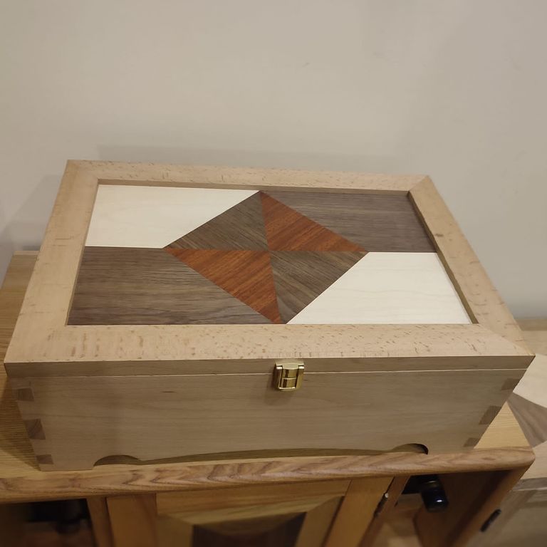 Фигурный набор шпона на филенке крышки, ее последующее фанерование или в вакуумном мешке, или методом "впритирку". Так же, крышка может быть изготовлена полностью из массива. (На усмотрение ученика)